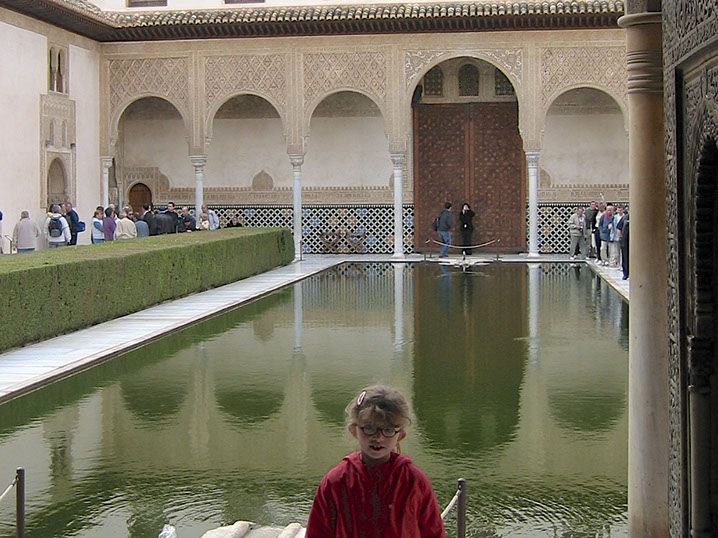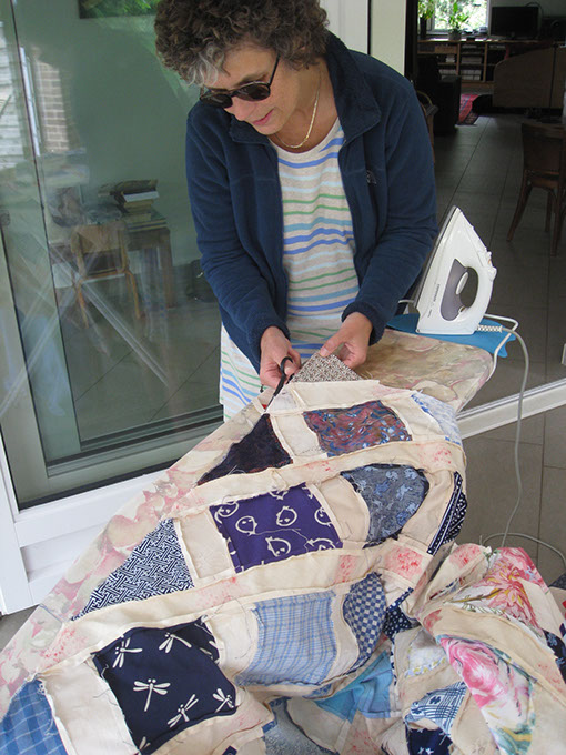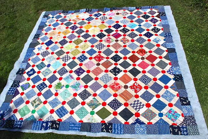 In de voorjaarsvakantie van 2004 waren Jos, Aafje, Adinda en Akelei in Andalusië, waar de tegelpatronen van het Alhambra indruk maakten. In november 2006 ging Aafje mee op tournee naar Japan waar ze 46 blauw-witte lapjes kocht (helaas geen idee waar deze halve metertjes voor dienen, ook geen foto gemaakt op een plaats waar deze wel te koop waren, toch nog eens navragen). In de zomer van 2012 heeft Hanneke de deken afgemaakt die al een hele tijd half-af bij Aafje in de kast was beland. (Dank je wel, mam!) Je ziet de Japanse lapjes en het Moorse tegelpatroon. De rode sterren zijn geschilderd. Het stikwerk is uitgevoerd door “The finished Quilt” in Sittard.