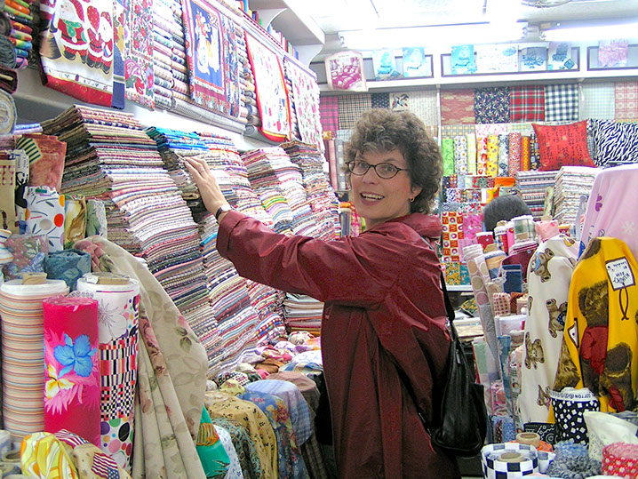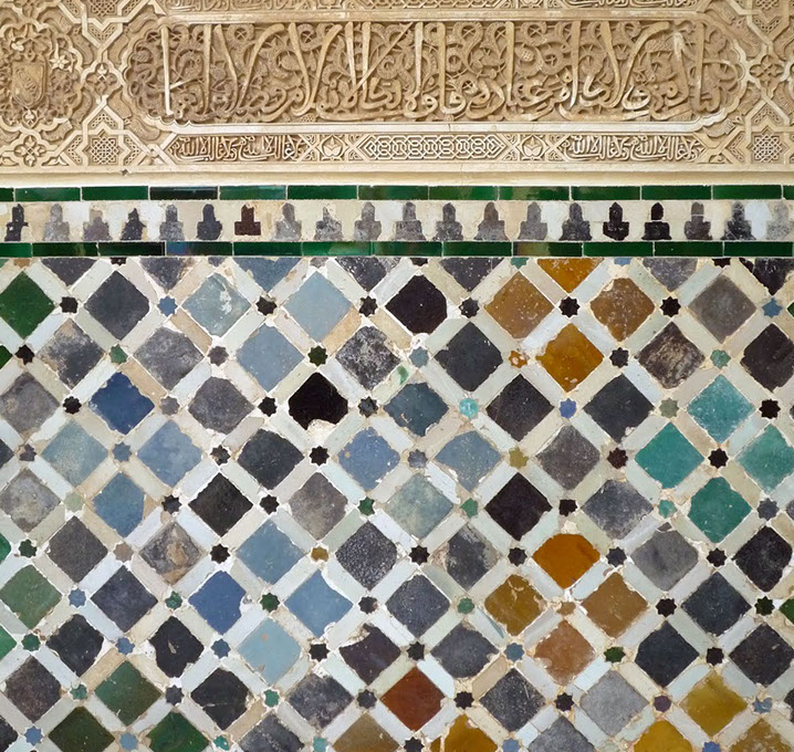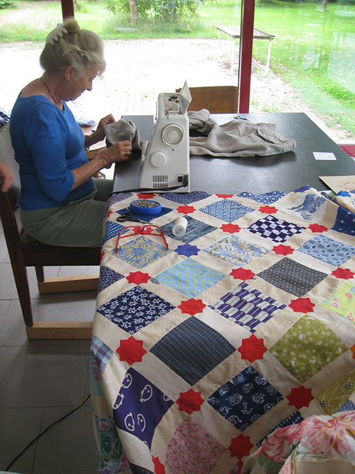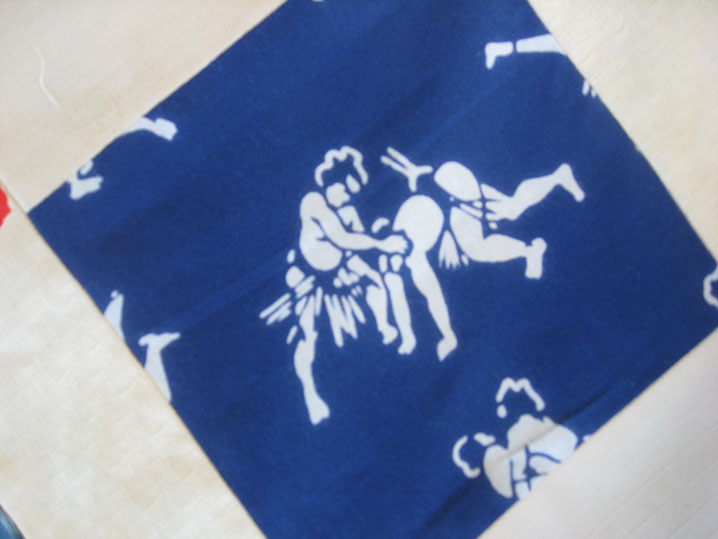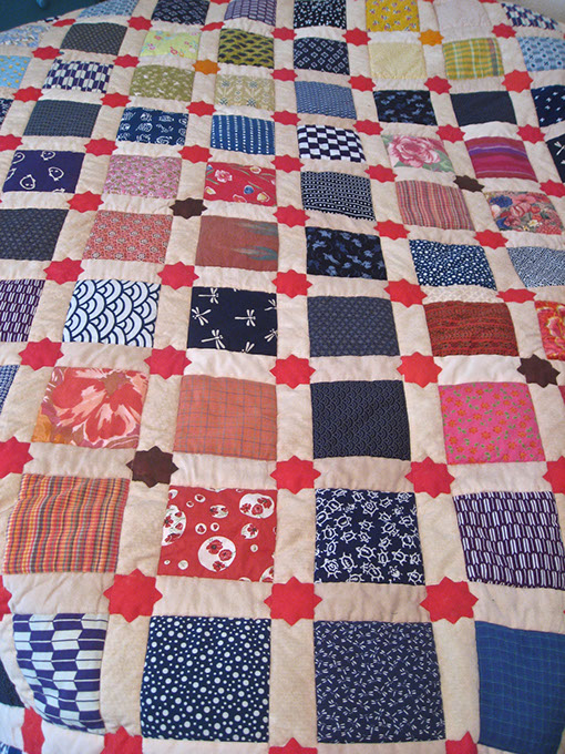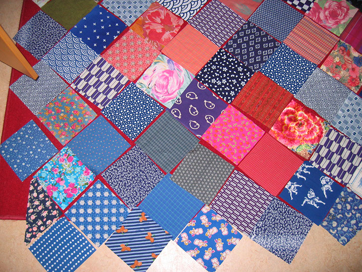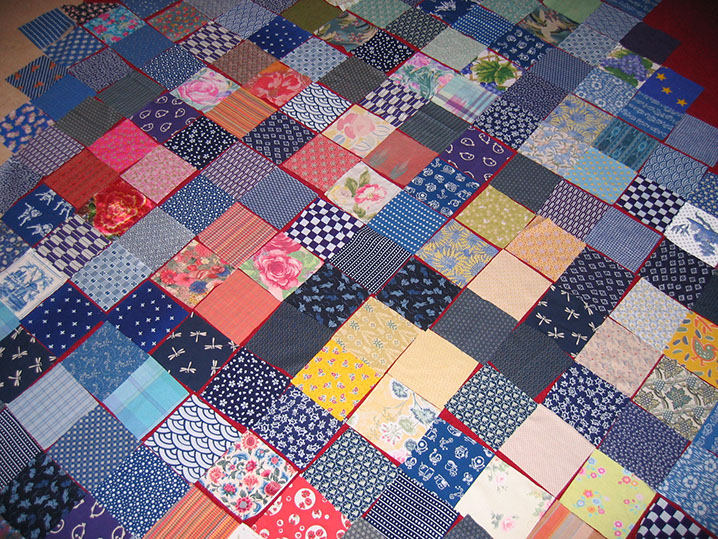 In de voorjaarsvakantie van 2004 waren Jos, Aafje, Adinda en Akelei in Andalusië, waar de tegelpatronen van het Alhambra indruk maakten. In november 2006 ging Aafje mee op tournee naar Japan waar ze 46 blauw-witte lapjes kocht (helaas geen idee waar deze halve metertjes voor dienen, ook geen foto gemaakt op een plaats waar deze wel te koop waren, toch nog eens navragen). In de zomer van 2012 heeft Hanneke de deken afgemaakt die al een hele tijd half-af bij Aafje in de kast was beland. (Dank je wel, mam!) Je ziet de Japanse lapjes en het Moorse tegelpatroon. De rode sterren zijn geschilderd. Het stikwerk is uitgevoerd door “The finished Quilt” in Sittard.